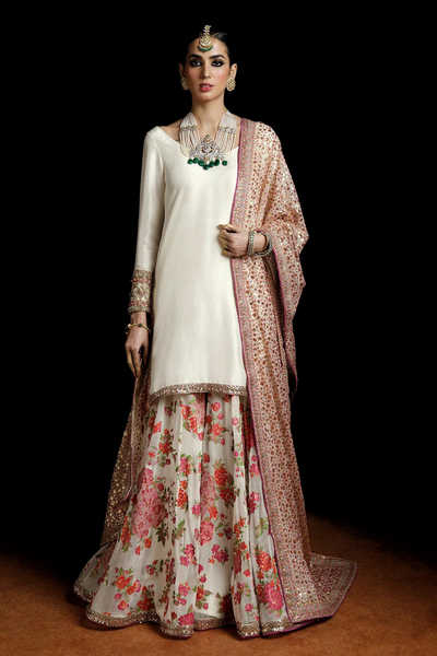 This ivory raw silk shirt is adorned with golden nakshi, sequins, pink and red bugle beads, and golden dabka on the hems. It is paired with a block-printed chiffon sharara featuring similar embellishments. The look is completed with a heavily embellished multi-head dupatta, framed with intricate borders on all four sides.