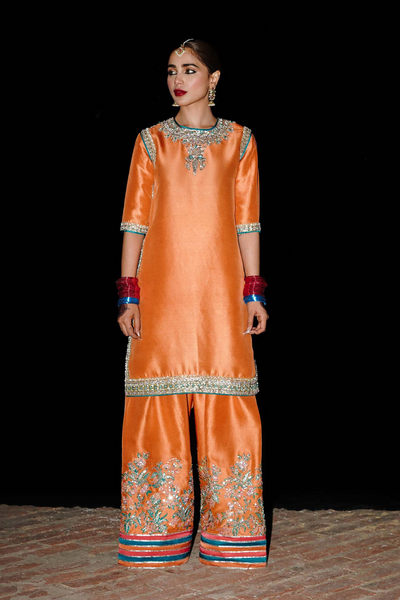 This stunning light orange ensemble from Hussain Rehar Luxury Pret Eid '23 radiates elegance and intricate craftsmanship. The raw silk shirt is adorned with a beautiful neckline and borders featuring silver Mukesh work, silver naqshi, silver sequins, teal green sequins, silver dabka, and pink bugle beads, adding a touch of luxury. The matching shalwar is similarly embellished with exquisite embroidery and embellishments, enhanced by a charming border for a striking finish. The outfit is completed with a teal blue organza dupatta, featuring sequin spray and an embellished border, offering a perfect balance of sophistication and grace. Ideal for any formal event, this ensemble offers a modern yet timeless aesthetic.