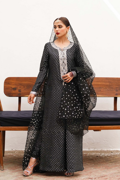 This stunning black ensemble from Hussain Rehar's Luxury Pret Eid '23 collection features exquisite screen printing across the shirt, creating a timeless yet modern look. The delicate neckline is beautifully adorned with silver Mukesh work, complemented by dainty embellishments of silver pipes, sequins, bugle beads, dabka, and naqshi. The ensemble is paired with an Indian raw silk screen-printed chooridar and an organza dupatta, which is embellished with a spray of silver chunks for a touch of sophistication. This elegant piece is perfect for making a statement at any special occasion.