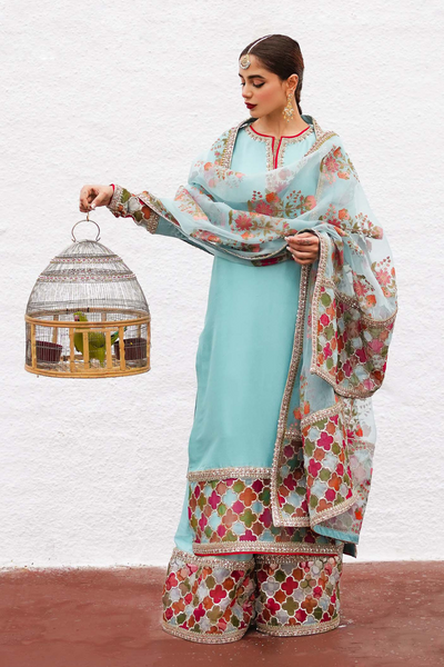 This enchanting ice-blue raw silk shirt from Hussain Rehar's Luxury Pret Eid '23 collection is an embodiment of elegance. It features a multi-colored border with delicate pita work, golden naqshi, golden sequins, and pink bugle beads along the hem and sleeves. The neckline is intricately designed with pink, ice blue, and green bugle beads, golden naqshi, and sequins, enhancing its luxurious appeal. Paired with raw silk palazzo pants featuring similar embellishments, this ensemble is completed with a 3-yard organza dupatta, featuring block-printed motifs and a multi-colored border on both sides, offering a perfect blend of tradition and contemporary charm.