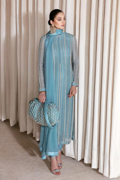 The Moon In The Golden Cup collection by Hussain Rehar features a delicate ice blue organza shirt with intricate loop buttons in the front and heavy embellishments of pearls, sitara, moti, Swarovski, and cutdana for a luxurious touch. The shirt is lined with ice-blue medium silk for added comfort and elegance. It is paired with Indian raw silk chooridaar pants and a stunning ice blue organza dupatta, beautifully spread with sequin chatta, adding a hint of glamour to the ensemble.
