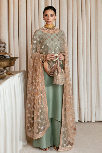 The Moon In The Golden Cup collection by Hussain Rehar presents a refined plain pistachio raw silk shirt featuring a round neckline and full sleeves, offering a classic and elegant silhouette. It is paired with plain raw silk palazzo pants for a seamless look. The outfit is completed with a stunning peach dupatta, beautifully adorned with a jaal of sequins all over, along with a 4-sided sequin border, adding a touch of sparkle and sophistication to the ensemble.