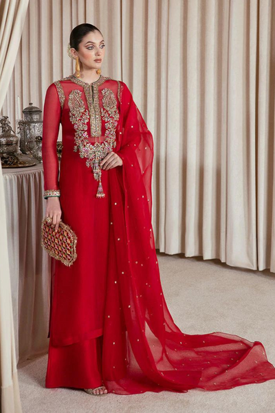 The Moon In The Golden Cup collection by Hussain Rehar introduces an absolutely regal red organza shirt, exquisitely embellished in the front with intricate nakshi, dabka, sitara, and cutdana work in a vibrant multicolor palette. The shirt is paired with a satin slip for a smooth finish. It also includes red raw silk palazzo pants with practical side pockets for added convenience. The ensemble is completed with a stunning organza dupatta featuring a delicate dequin chatta embellishment, creating an opulent and refined look.