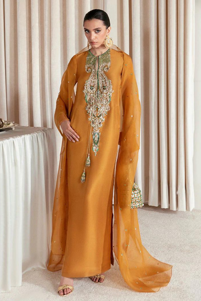 The Moon In The Golden Cup collection by Hussain Rehar introduces a charming mustard raw silk shirt, featuring front tassels and side pockets for added convenience. The shirt is beautifully embellished on the neckline with intricate nakshi, sitara, dabka, and cutdana work in stunning hues of gold and green, creating an elegant and refined look. It is paired with an exquisite organza dupatta, adorned with a spread chatta of green and gold sitara, adding a touch of luxury to the ensemble.