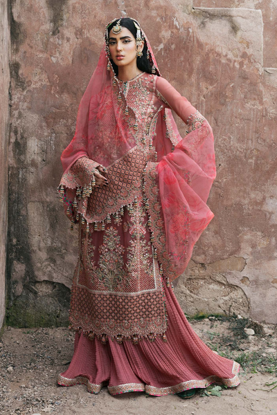 Digital Printed Embroidered Dupatta (Organza) 2.50Meters Embroidered Dupatta Pallu (Organza) 2.30Meters Embroidered Front Center Panel Embellished (Organza)1.00Piece Embroidered Front Right Panel Embellished (Organza) 1.00Piece Embroidered Front Left Panel Embellished (Organza) 1.00Piece Embroidered Back Spray (Organza) 0.78Meters Embroidered Sleeves Embellished (Organza) 2.00Pieces Dyed Sleeve Extensions (Organza) 0.45 Meters Embroidered Front Border Embellished (Organza) 0.78Meters Embroidered Back Border (Organza) 0.78Meters Embroidered Side Extensions Front Back & Sharara Border (Organza) 9.15Meters Dyed Crushed Sharara (Silk) 6.00Meters Printed Finishing For Shirt (Satin Silk) 1.35Meters Dyed Inner (Thai Silk) 3.60Meters