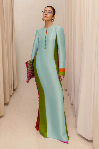 A long floor length ice blue shirt the sides of the shirt a detailed with long green and orange panels along with loop buttons descending down till the slits.