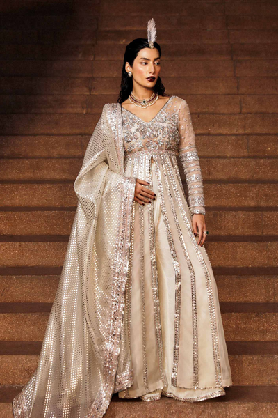 This stunning ivory ensemble from Hussain Rehar's "Parday ke Peechey Luxury'23" collection is a true style statement. The shirt, crafted from organza with intricate paneling, is paired with luxurious velvet palazzo pants. The screen-printed polka dot dupatta, with heavily embellished borders on all four sides, is adorned with sequins, cut dana, nakashi, and dabka, making it an exceptional piece. With its regal charm and attention to detail, this outfit is designed to captivate and elevate any occasion.