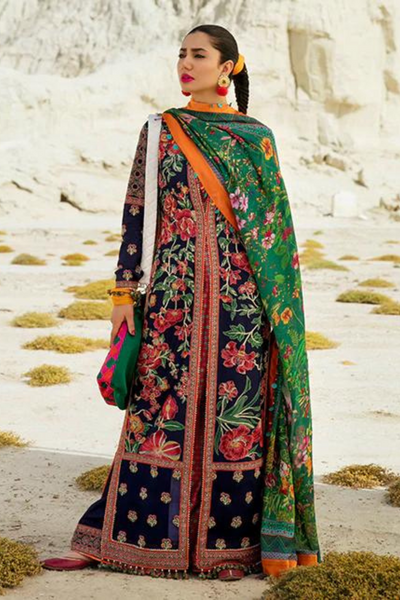 This unstitched ensemble by Hussain Rehar is designed with intricate details and luxurious fabrics. The shirt is crafted from premium lawn fabric, featuring embroidered front and back panels, sleeves, and borders. The side extensions add a touch of elegance with additional embroidery on the front and back. The trouser is made from soft cotton, complemented by an embroidered border, while the digital printed silk dupatta completes the look. The shirt is finished with satin silk for added finesse. This set promises a blend of sophistication and style, perfect for various occasions.