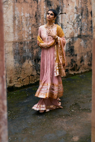 From Iqbal Hussain’s Gota Collection, this luxurious outfit combines traditional craftsmanship with modern elegance. The pink crushed pishwas is crafted from pure grip silk with delicate gota lines and a pure raw silk body and sleeves, both adorned with intricate gota work. It is paired with a pink crushed dhaka pajama in pure grip silk, featuring matching gota lines for a cohesive look. The ensemble is completed with a striking tri-colored pure organza dupatta, featuring gota lines on the palloo, adding a touch of vibrancy and grace. A perfect choice for festive occasions, exuding timeless elegance.