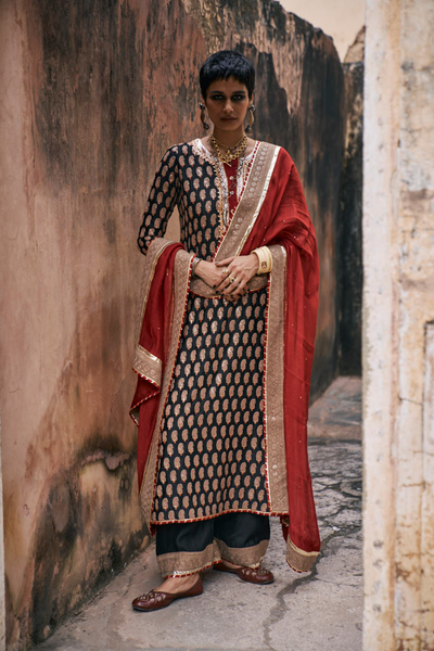 From Iqbal Hussain’s Gota Collection, this stunning outfit combines sophistication and rich craftsmanship. The black shirt in pure maple raw silk features intricate ari paisley work and delicate gota detailing on the neckline and sleeves, creating a timeless look. Paired with a matching black ijaar in pure khaddi silk, it is finished with a thick ari work border and gota accents for added elegance. The ensemble is completed with a striking red dupatta in pure cotton silk, adorned with four-sided thick ari work borders, gota finishing, and kaamdani all over, making it a perfect choice for special occasions.