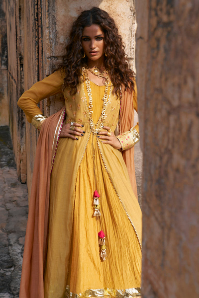 Step into festive elegance with this striking outfit from Iqbal Hussain’s Gota Collection. The ensemble features a mustard yellow sleeveless upper shirt in pure cotton silk, adorned with gota work on the body and playful tassels on the sides. Beneath it flows a crushed inner pishwas in pure grip silk, finished with a rich tilla and gota border on the gher. Paired with a lime green crushed Dhaka in pure grip silk, also detailed with a matching tilla and gota border, the look is completed by a saffron cotton silk dupatta edged with hot pink gota finishing.
