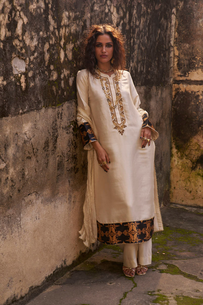 This timeless ensemble from Iqbal Hussain’s Gota Collection blends tradition with refined elegance. The ivory shirt, crafted from pure raw silk, features exquisite zardozi embroidery on the neckline, paired with a luxurious black pure charmeuse border on the daman and sleeves, all finished with delicate gota detailing. Complementing the shirt is a classic ivory ijaar made from pure raw silk, offering both comfort and grace. The look is beautifully completed with a crushed ivory dupatta in pure cotton silk, adorned with gota finishing on all four sides, creating a graceful and festive statement perfect for any occasion.