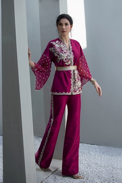 ARCANE  Plum Raw Silk Ensemble by  IMRA SAEED