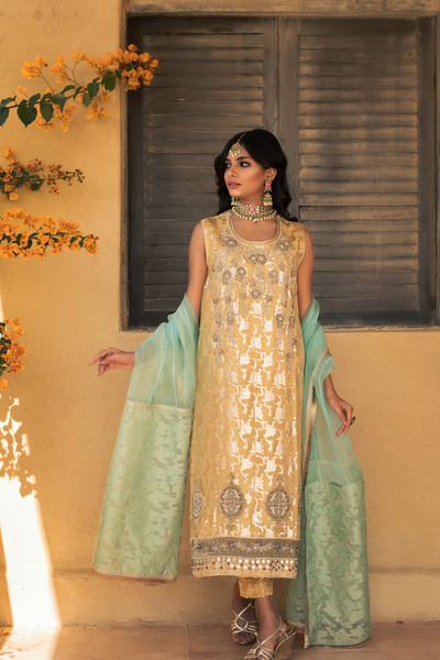 This luxurious gold tissue kurta from Insia Sohail is heavily embroidered on the front, showcasing intricate craftsmanship and a regal design. It is paired with matching jamawar trousers that complement the kurta’s richness. The outfit is completed with a contrasting organza dupatta, adding a touch of elegance and sophistication. Perfect for formal occasions or festive celebrations, this ensemble combines timeless luxury with a modern flair. Authenticity Guaranteed 100% Original.
