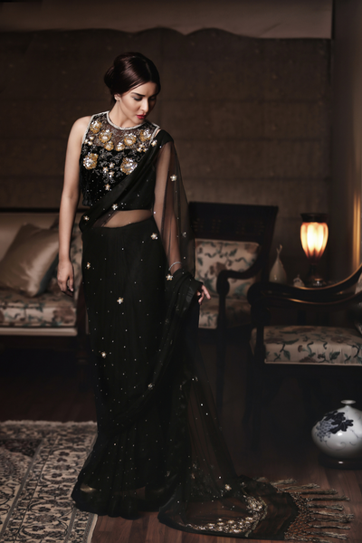 This exquisite black sari by Insia Sohail features a net fabric with intricate embellishments. The pallu is adorned with sequins, floral patterns, pearls, and dabka detailing, all framed by a tassel border that adds movement and grace to the design. It comes with a petticoat for a perfect fit. The matching velvet blouse is available separately and is beautifully detailed with hand-embroidered pearls, sequins, and dabka work on a net base. This luxurious ensemble is perfect for formal occasions, offering a timeless blend of elegance and modern craftsmanship.