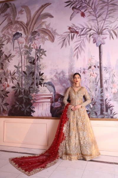 The overall needlework in lavish elaboration on a contrasting maroon dupatta is perfect addition of tradition to this design. A tale of royalty adorned by brides on their big day.