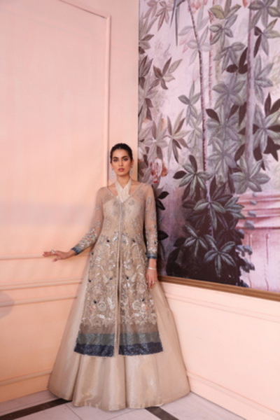 A hyperbolic wide-legged one-piece paired with an overdrapery bejeweled in the luxury of nakshi needlework tied with convoluted zardozi technique and shining the minutiae of crystals overlaid the modishly affluent tissue fabric.