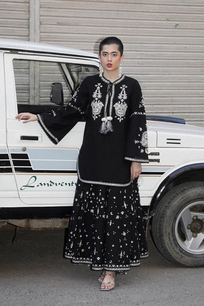 The Moonlit ensemble from Jugnu's SS/24 Edit-III exudes timeless elegance and cultural richness. The black traditional ivory embroidered short shirt features intricate Pani (metallic foil) detailing, elevating the outfit with sophistication. Tassel accents and a round hem refine the silhouette, enhancing its graceful charm. Paired with a black panel skirt adorned with ivory embroidery and Pani highlights, this ensemble strikes a perfect balance between classic and modern appeal. A printed silk scarf completes the look, adding a luxurious, vibrant touch. Ideal for cultural celebrations or special occasions, this 3-piece set (top, bottom, and dupatta) guarantees 100% originality and authenticity.