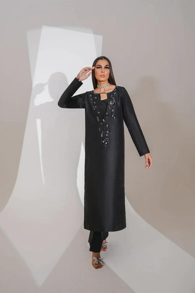 The Khakaa Belle Lumiere '23 collection features a long raw silk shirt paired with boot-cut pants. The shirt is beautifully adorned with floral handwork and ribbon detailing around the neckline, while the addition of hand-embellished crystals and cut dana adds a touch of elegance and bling to the design. This ensemble combines refined craftsmanship with contemporary flair.