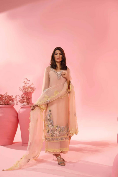 The Khakaa Devenir Rogue'23 ensemble features a whimsical pure organza shirt layered over a Thai silk inner, paired with raw silk pants. The design is accentuated with neon and pasted embroidery, adding a vibrant touch. Embellishments include sequins, milky cut dana, naqshi, and experimental materials, giving the outfit a delicate and intricate look. This piece combines modern elements with traditional craftsmanship, creating a refined yet contemporary aesthetic perfect for special occasions.