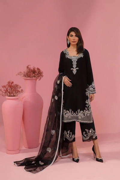 The Khakaa Devenir Rogue'23 Black ensemble is a timeless addition to any wardrobe. This exquisitely embellished Korean raw silk shirt and pants are paired with a black organza dupatta, creating a sophisticated contrast. The ensemble is adorned with a variety of pearls, silver naqshi, and sky blue sequins, adding a touch of elegance and sparkle. The combination of classic black with intricate embellishments makes this set both classy and chic, perfect for any occasion that calls for refined style.