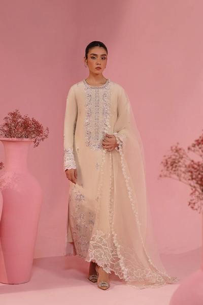 The Khakaa Devenir Rogue'23 Spring Summer set exudes femininity and elegance. The ensemble features a refined Korean raw silk shirt paired with matching pants, complemented by a delicate organza dupatta. The shirt is beautifully embellished at the neckline, borders, and sleeves with intricate sequin, crystal, and naqshi work, ensuring a head-turning look. This luxurious set is perfect for any occasion where sophistication and glamour are a must.