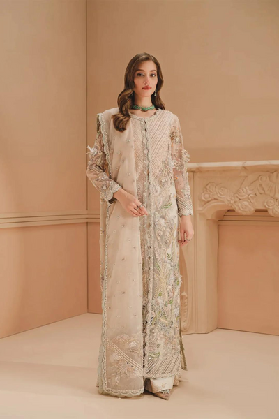 This exquisite creation from Khakaa's "Série Luxuriante'23" collection is a vision of sheer elegance. A soft breeze of powder pink graces the delicate fabric, adorned with fragmented leaves and floral patterns, all encrusted with sparkling gems and jewels. The intricate embellishments create a dazzling, opulent effect, making this ensemble the perfect blend of grace and glamour. A 100% original masterpiece that will captivate and leave a lasting impression at any special event.