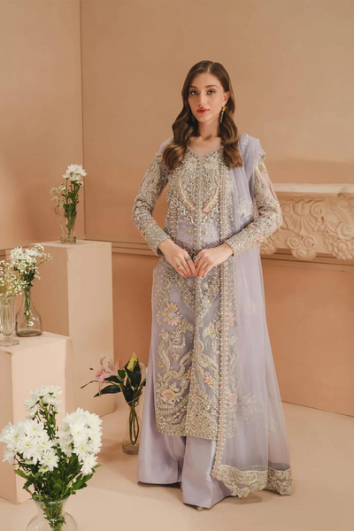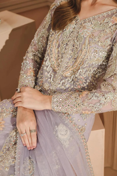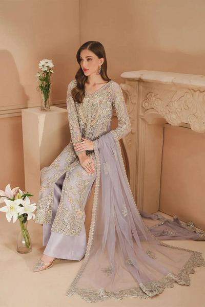 This breathtaking creation from Khakaa's "Série Luxuriante'23" collection features a heavily embellished shirt crafted on a delicate net canvas, with intricate work on the front, back, and sleeves. The design exudes a magical charm, perfectly paired with raw silk flared pants that complement the opulent aesthetic. The stunning net dupatta is adorned with marvelous details, adding a splendid finishing touch to the ensemble. A 100% original masterpiece, this outfit is an ideal choice for those seeking a refined and luxurious look for special occasions.