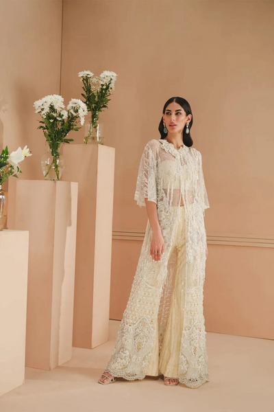 Introducing a timeless masterpiece from Khakaa's "Série Luxuriante'23" collection, where the elegance of ivory and white comes together in perfect harmony. The long jacket, adorned with exquisite tassels on the front and sleeves, adds a touch of opulence, while the intricate cut dana detailing enhances the overall charm. Paired with bootcut pants, this ensemble perfectly complements its glamorous allure. A true work of art, this 100% original creation effortlessly captures attention, making it an impeccable choice for sophisticated occasions.