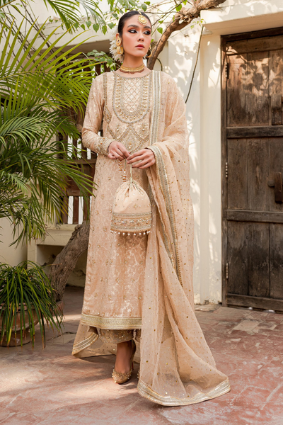 This nude ensemble from Kanwal Malik 'Afreen' Luxury Pret showcases elegance and intricate craftsmanship. The zari jamawar shirt features a handcrafted neckline, sequins, pearls, and adorned sleeves with constructed borders, exuding luxury. Paired with zari jamawar trousers embellished at the border and a pure khaddi cotton net mukesh dupatta with a four-sided border, the outfit creates a harmonious blend of sophistication and grace. Size customization is available, with delivery promised within 6 to 8 weeks. Authentic and meticulously crafted, this ensemble is perfect for refined occasions.