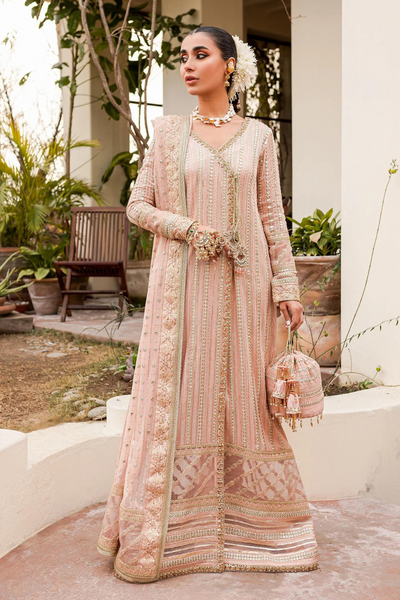 This elegant powder pink angrakha gown from Kanwal Malik 'Afreen' Luxury Pret exudes timeless charm. Adorned with a sprinkling of panni and handcrafted tassels, it features intricate add-on borders for added refinement. Paired with a chikankari dupatta and PK silk chooridar pajama, the outfit offers a visually enchanting evening look. Customizable in size and color, it guarantees authenticity and exceptional craftsmanship, delivered within 6 to 8 weeks.