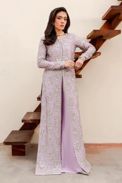 The "Zoya" ensemble by Kanwal Malik is a beautifully crafted, subtle lilac front-open long shirt. Featuring a silver tilla embroidered base and intricate hand embellishments, this outfit radiates sophistication. Paired with matching silk flared pants, it is ideal for formal occasions. Color: Lilac. Includes: Gown, Slip, Flared Pants. Size customization available. Color customization available. Delivery time: 6 to 8 weeks. Authenticity: 100% Original.