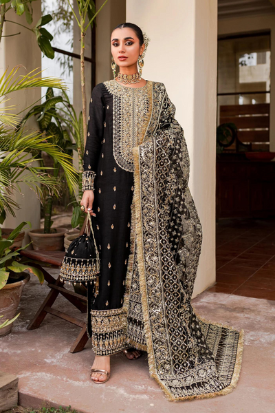The "Afreen" ensemble by Kanwal Malik is a blend of tradition and luxury. The black Korean silk shirt features a long neckline adorned with intricate guff borders, blending floral and geometric patterns with sequins and naqshi embellishments. It’s paired with a matching organza dupatta, embellished with sequined borders, adding a touch of elegance. The ensemble is completed with a sleek chooridar pajama in PK silk. Ideal for sophisticated occasions, this outfit offers customization for size and delivers a timeless, regal look. Delivery Time: 6 to 8 weeks. Authenticity: 100% Original.