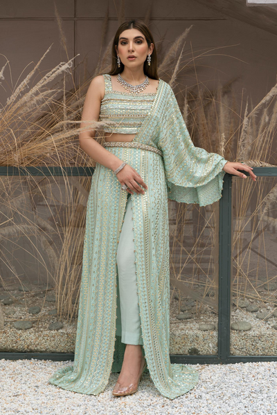 This chic mint green chikankari masterpiece from Kanwal Malik's Athena Formal Pret collection exudes elegance. The hand-embellished bodice, adorned with sparkling ornamentation, is set against a beautiful light seafoam canvas, creating a modern, sophisticated look perfect for both day and night events. The draped shirt adds a flair of grandeur, while the silk pants complete the ensemble. This versatile outfit can be customized for size and color to suit your preferences.