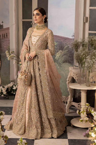 The Light Pink Organza Pishwas by Kanwal Malik | Jahanara Bridal Couture '23 exudes timeless sophistication with its delicate organza fabric, creating an enchanting silhouette. The ensemble features a Jamawar Embellished Bustier, adding traditional opulence through intricate detailing. The Jamawar Lehenga, adorned with a subtle spray and embellished border, adds regal dimension. Complementing this look is the Organza Dupatta, with a delicate spray and hand-embellished four-sided border, enhancing the overall grace and sheer elegance. This bridal ensemble promises effortless movement and unmatched beauty. Custom size and color options available, with 12-week shipping. 100% authenticity guaranteed.