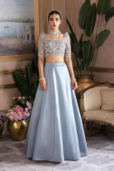 Product Description: The regal silver tones are beautifully translated on a light hue of blue, which makes this lehnga choli standout in the crowd.