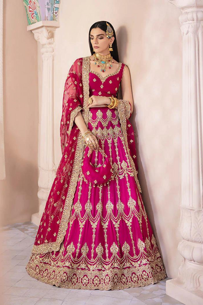 Includes: Choli, Lehnga, Dupatta Details of Fabric: Shirt: Korean Raw Silk Lehnga: Korean Raw Silk Dupatta: Organza Color: Shocking pink Shipping time:.8 to 10 weeks. Customization: Size Customize: Yes Color Customize: No Potli Bag [INR 10,500]