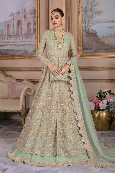 Product Description: Crafted from soothing mint green organza, this mesmerizing front open gown is laden with intricate embellishments in hues of mint and pinks.