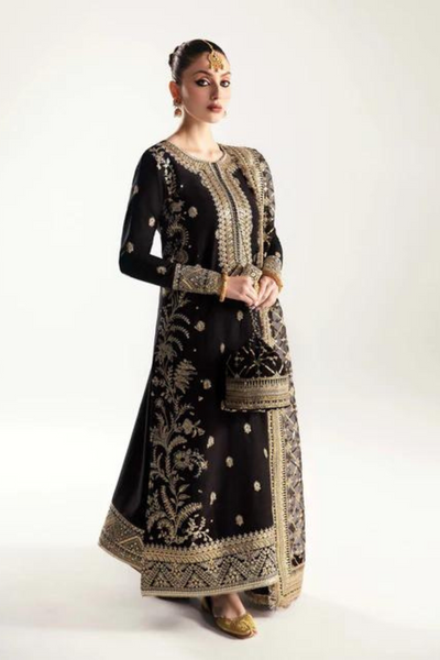 Step into timeless sophistication with Kanwal Malik’s Black Twin-sequined Korean Rawsilk Ensemble from Jugan Luxury Pret'24. The luxurious black Korean raw silk radiates elegance, while twin-sequined tilla embroidery adds opulence and allure. Seamlessly paired with a chic chooridaar, it creates a flattering silhouette that enhances feminine charm. The ethereal Organza Twin-Sequined Panni Jaal Dupatta, adorned with intricate sequined patterns, completes the look with a mesmerizing play of light and shadow. Authenticity guaranteed, this statement piece is perfect for weddings or festive celebrations, ensuring you shine with unparalleled grace.