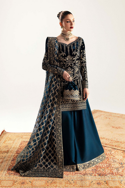 Immerse yourself in elegance with the Teal Velvet Short Shirt from Kanwal Malik's Jugan Luxury Pret'24 collection. The luxurious teal velvet shirt exudes opulence, while the Korean raw silk sharara pants add a modern touch of grace. Paired with a meticulously designed Composed Organza Jaal Dupatta, this ensemble is a perfect blend of tradition and contemporary allure. The intricate dupatta drapes delicately, adding an ethereal charm to the look. A true celebration of timeless style, this ensemble elevates your fashion game with plush velvet, chic sharara pants, and the enchantment of organza.