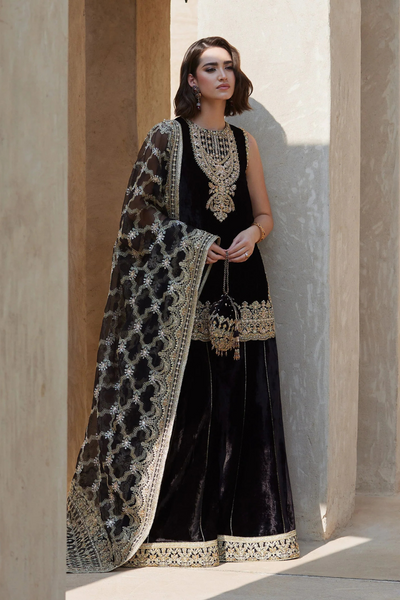 Elynor is the perfect blend of opulence and modern glamour. This black velvet ensemble features a sleeveless, short velvet shirt adorned with an embroidered and hand embellished neckline and intricate borders with dabka, kora, pearls, sequins, and crystals adding a touch of sophistication to the design. The shirt is paired with luxurious velvet flared pants, creating a flattering and chic silhouette. Completing the look with a fully embroidered organza dupatta, featuring a mesmerizing spray of sequins and pearls that adds a dazzling touch of sparkle. Elynor is the elegant statement piece that brings together plush velvet and intricate craftsmanship in a truly mesmerizing way.