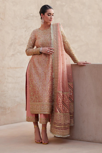 Dive into luxurious elegance with Nera, a stunning blush pink tissue ensemble that exudes timeless beauty. The outfit features delicate embroideries and intricate hand embellishments, bringing an air of sophistication to the graceful silhouette. Paired with culotte pants in raw silk, Nera effortlessly blends modern style with traditional charm. The ensemble is completed with a Mukesh dupatta, framed by four-sided borders and embellished with badla fabric on the pallu side, adding an extra layer of intricate detail. This look is the epitome of ethereal and easy elegance, perfect for those who appreciate refined luxury.