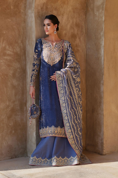 Aleha is a stunning blend of opulent velvet and intricate craftsmanship. The velvet shirt, featuring mesmerizing hand-embellished details with dabka, kora, pearls, and crystals, boasts a beautifully embroidered neckline and borders, adding a touch of refined sophistication. Paired with Korean raw silk flared pants, the ensemble offers a chic and flattering silhouette. Completing the look is a fully embroidered organza dupatta, adorned with a mesmerizing spray of sequins that adds shimmer with every movement. Aleha is a perfect balance of luxury and elegance, designed for those who appreciate finer details.