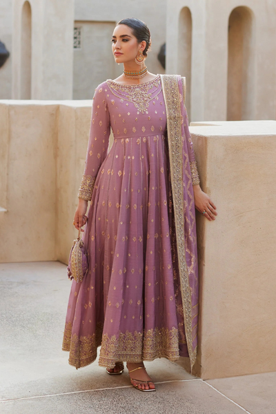 Vaneeza is a vision of elegance in soft lavender, designed to capture both grace and luxury. The ensemble features a beautifully crafted pishwas with a hand-embellished bodice, adding intricate detailing and charm. Made from luxurious zari silk fabric, the outfit is paired with PK raw silk churidar for a classic yet contemporary fit. Completing the look is a stunning Karandi zari dupatta, its delicate weave adding a touch of regal sophistication. Perfect for those who appreciate subtle yet striking beauty, Vaneeza is an exquisite blend of intricate craftsmanship and timeless design.