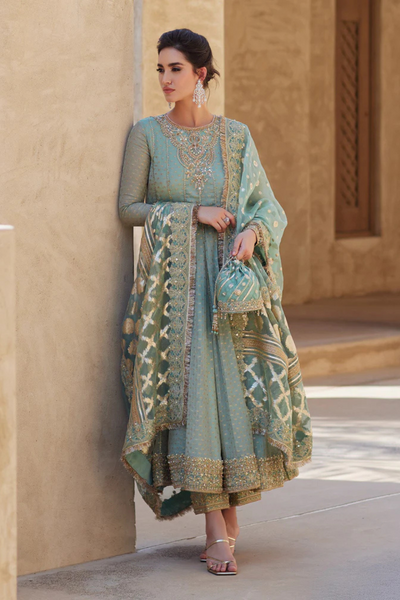 Mist is a mesmerizing fusion of tradition and contemporary elegance, featuring a beautifully crafted pishwas in luxurious masoori fabric in soft blue tones, with delicate hints of gold and pink that add depth and sophistication. Hand-embellished with intricate gold, gotta, and silver work, every detail of Mist is designed to captivate. It is paired with Korean raw silk culottes that offer a chic, modern touch, while the dupatta is framed with four-sided borders and extended fabric on the pallu side, enhancing the ensemble’s intricate craftsmanship and elevating its regal appeal. Mist is timeless beauty and a true statement piece.