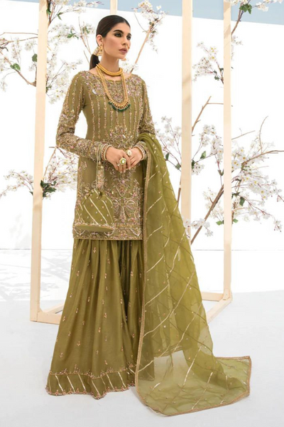 Mahjabeen by Kanwal Malik’s 'RIWAYAAT' collection embodies the richness of deep olive green, a perfect choice for a traditional mehndi bride. This stunning ensemble, curated on Korean raw silk, features a short shirt silhouette heavily embellished with timeless gotta, dabka, naqshi, and sitara, accented with delicate shades of pink. The outfit is beautifully paired with a Korean silk gharara with hand-embellished details at the hem and an elegant organza dupatta, adorned with gotta work and a soft spray effect.