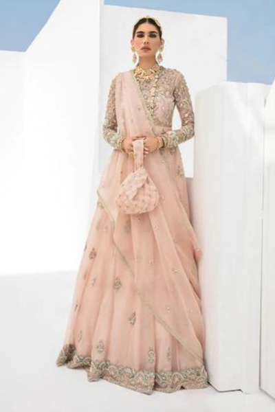 Achieve dreamy perfection with Parishay, a stunning powder pink pishwas from Kanwal Malik’s 'RIWAYAAT' collection. This exquisite piece features a hand-embellished bodice adorned with a blend of floral and geometrical motifs, adding a touch of sophistication. The organza base is beautifully enhanced with an embellished border on the hem, surrounded by beaming pearls and crystals. It comes with a matching organza dupatta, intricately scattered with crystals, completing this graceful ensemble.