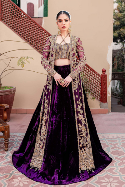 "Nazneen" is a contemporary cut design created for those who want to stand out and embrace a vibrant hue. This stunning ensemble features a choli adorned with an ornate jaal, beautifully enveloping the entire look, paired with a long, open organza gown in a striking purple shade. The base of the gown is delicately embellished with pearls, beads, and intricate embroidery, adding an extra layer of elegance. Complementing the gown is a luxurious velvet lehenga, giving the outfit a trendy, contemporary appeal. Made to order in customized size, with color customization options available. Authenticity guaranteed with 100% original Kanwal Malik-MaheNur Luxury Formal design.