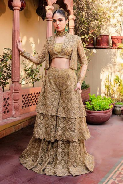 This exclusive net ensemble is beautifully crafted on a copper canvas, making it a standout piece in any crowd. Fully embellished, the outfit features an open jacket and a bustier-style cut, giving it a bold, modern look. The three-layered sharara pants, adorned with heavy embellishments, add a touch of opulence. Completing the contemporary look is a net dupatta that drapes elegantly. Made to order in customized size, with color customization options for a perfect fit. Authenticity guaranteed with 100% original Kanwal Malik-MaheNur Luxury Formal design.