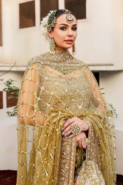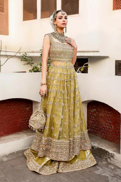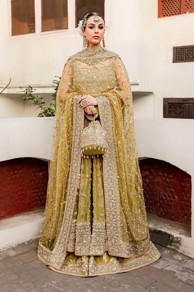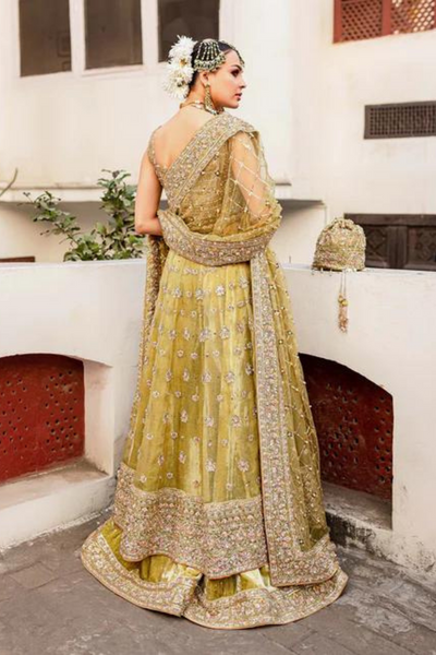 An elegant rhyme to tradition, "Sunehri" creates aesthetic magic with its eye-catching embroidery. This outfit combines timeless charm with traditional appeal, featuring an open-cut organza pishwas beautifully embellished with a heavy yok pattern and intricate borders. Paired with a luxurious velvet sharara, it exudes opulence. The heavy jaal embellishments on the dupatta’s border enhance the ensemble’s evergreen allure. Made on customized size, with color customization options for a perfect fit. Authenticity guaranteed with 100% original Kanwal Malik-MaheNur Luxury Formal design.